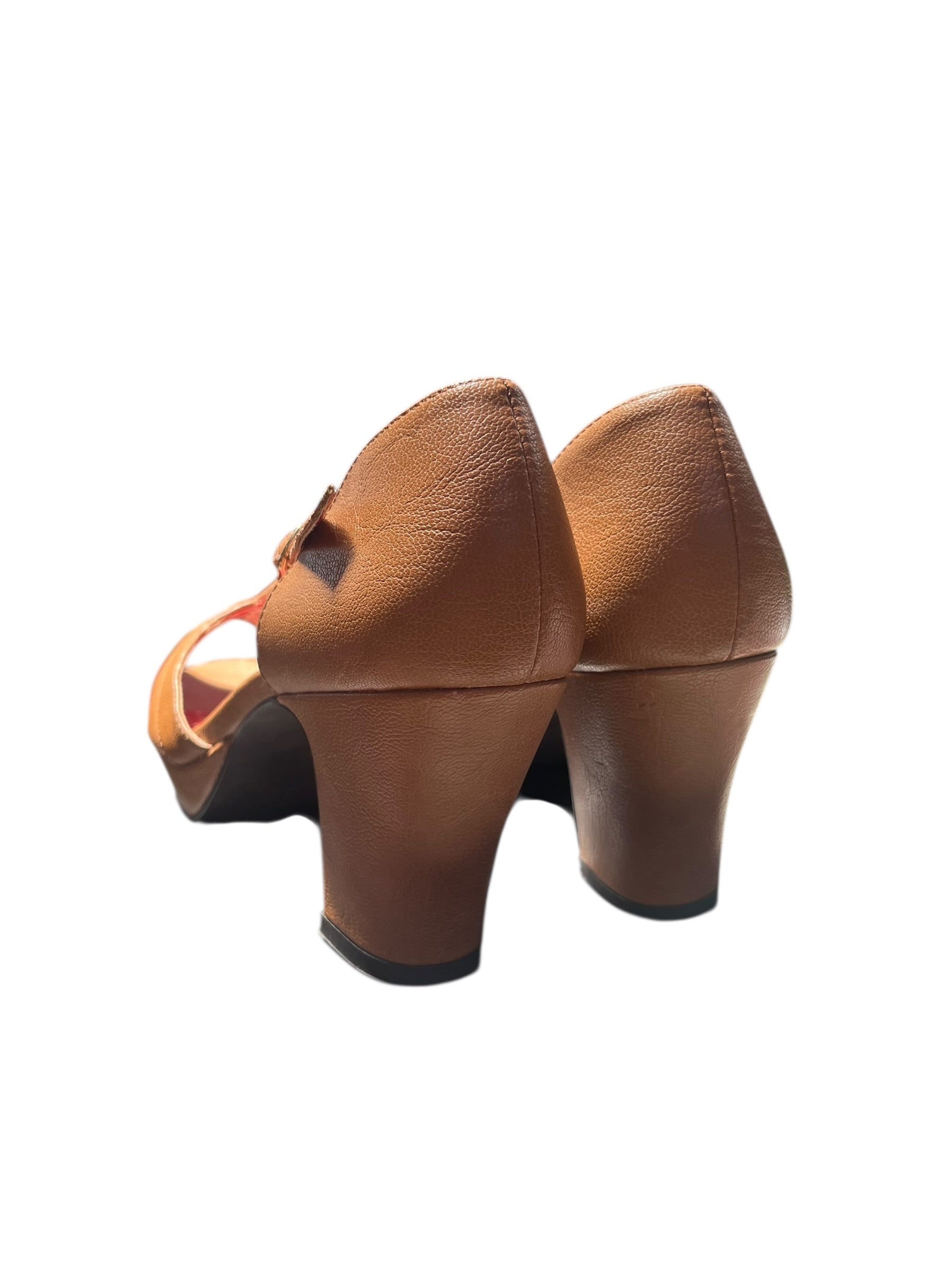 Brown block heels with double strap.