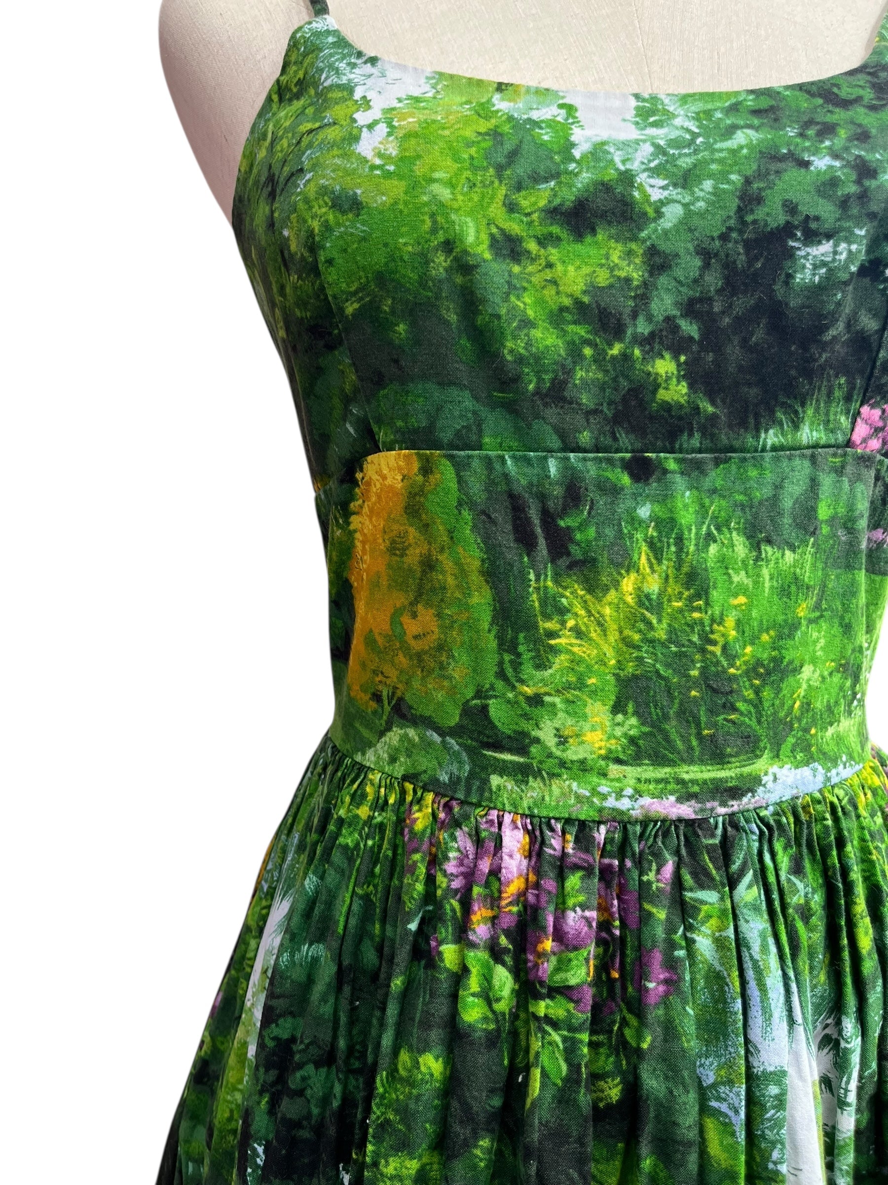 Bernie Dexter garden dress with thin straps, full skirt and pockets.
