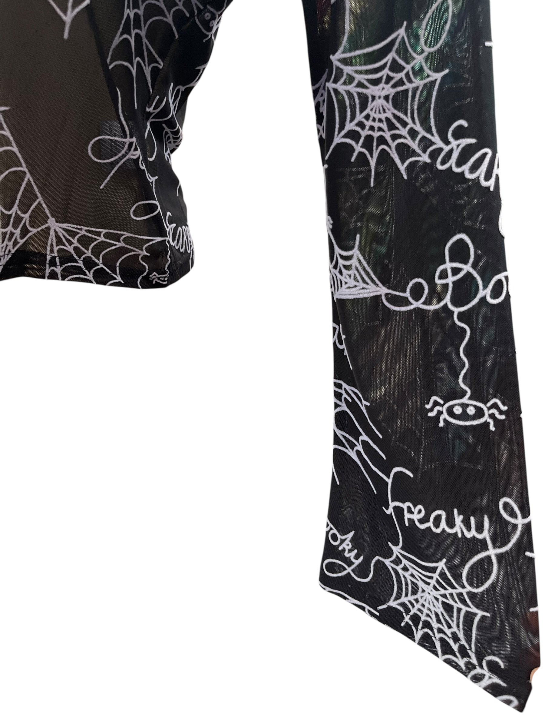 Black mesh top with flared sleeves.
