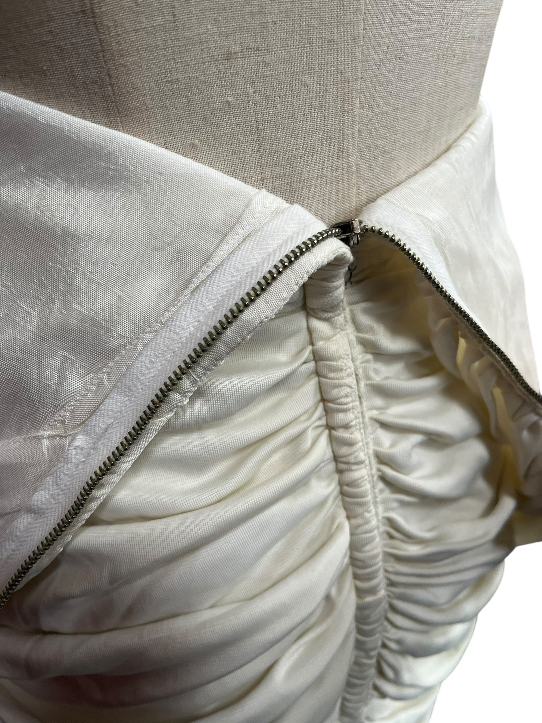 This gorgeous cream ruched dress from Blanes London hugs the figure in all the right places, creating an elegant and flattering silhouette. A sleek metal zip at the back adds a modern touch and ensures a perfect fit. With soft ruching that adds texture and shape, this dress is ideal for a wedding, a hens night, or any special event where you want to shine. Totally gorgeous and effortlessly stylish.