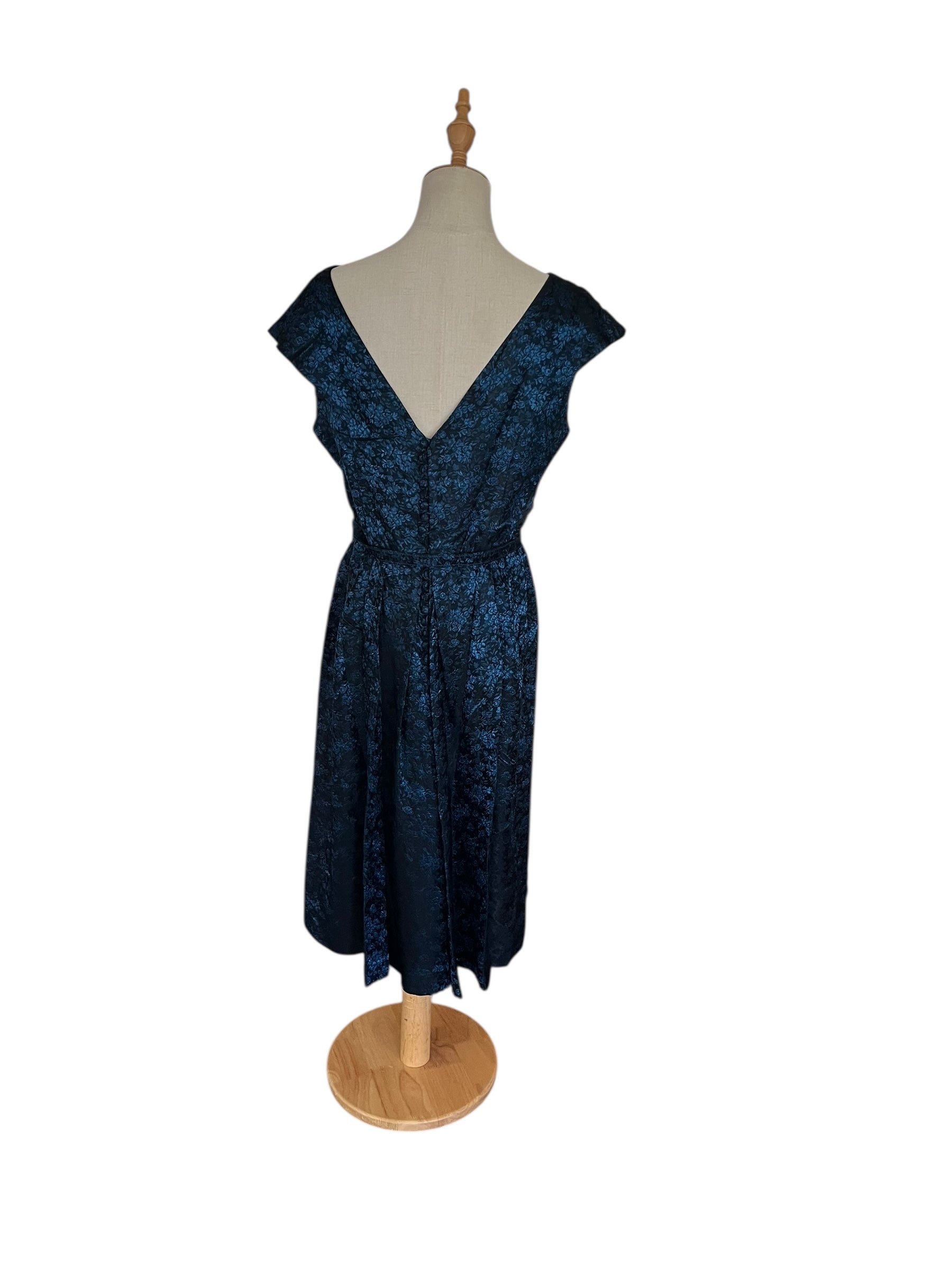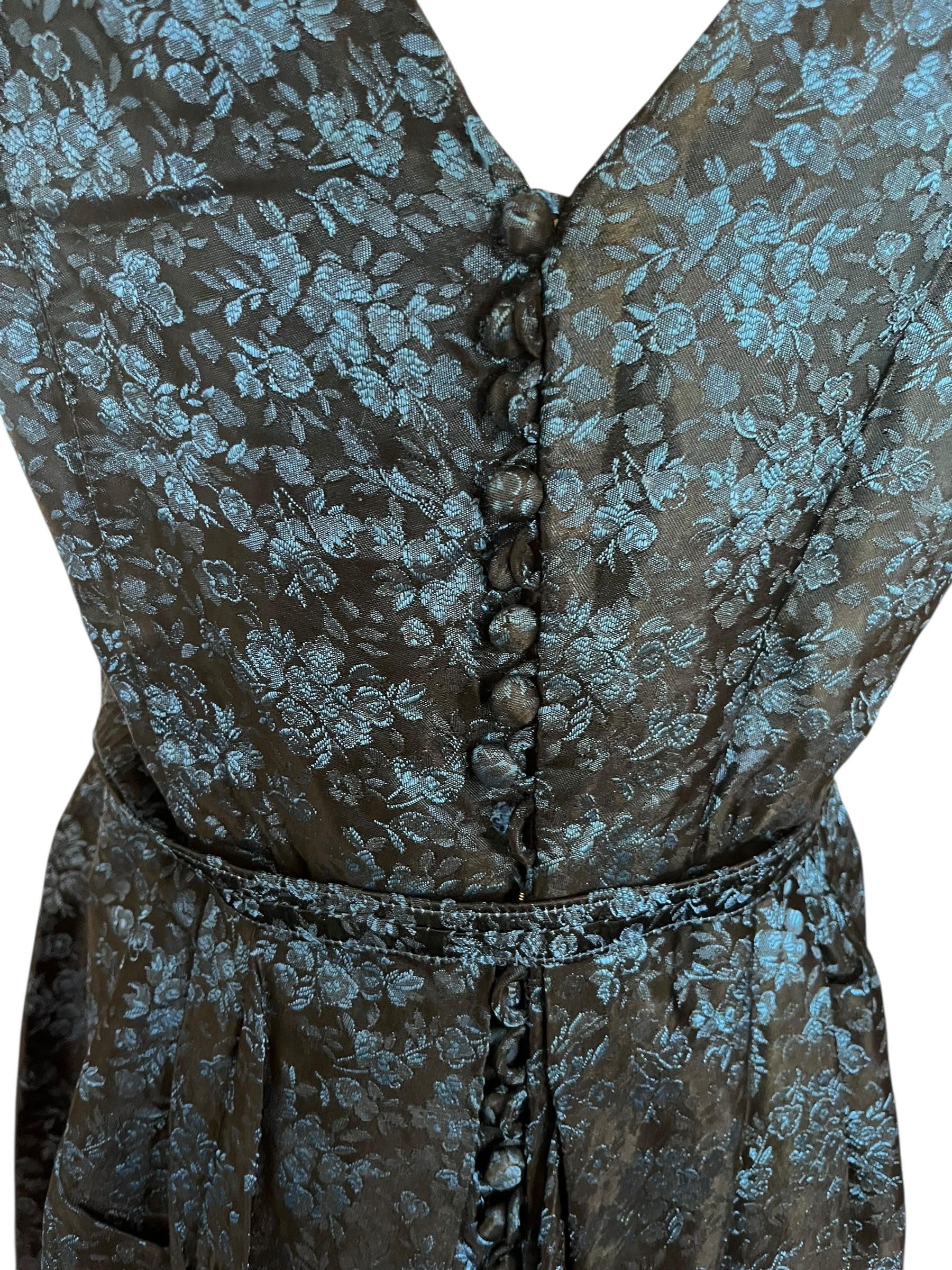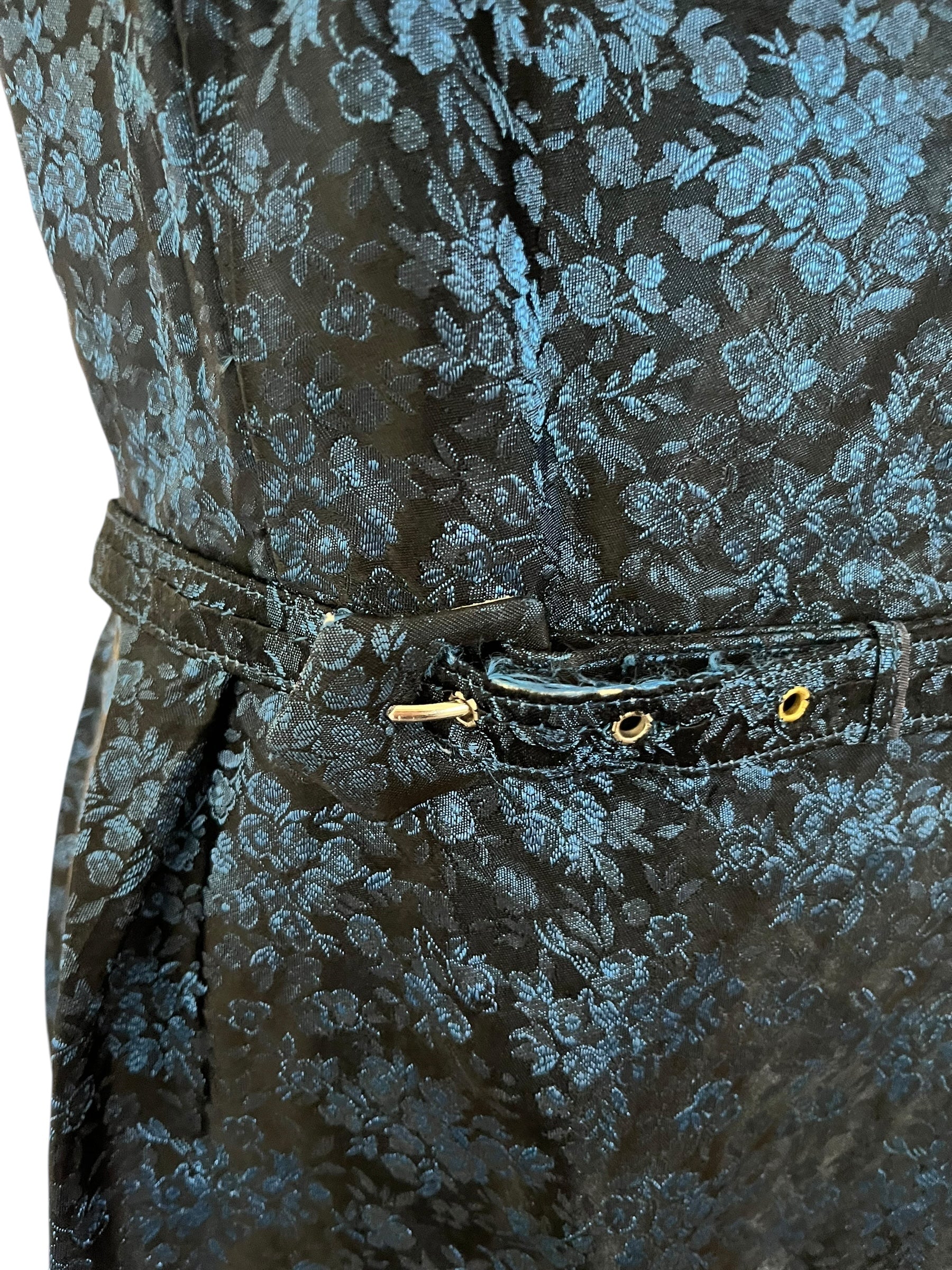 Beautiful black satin with subtle blue roses. Buttons up the back and comes with a matching belt.