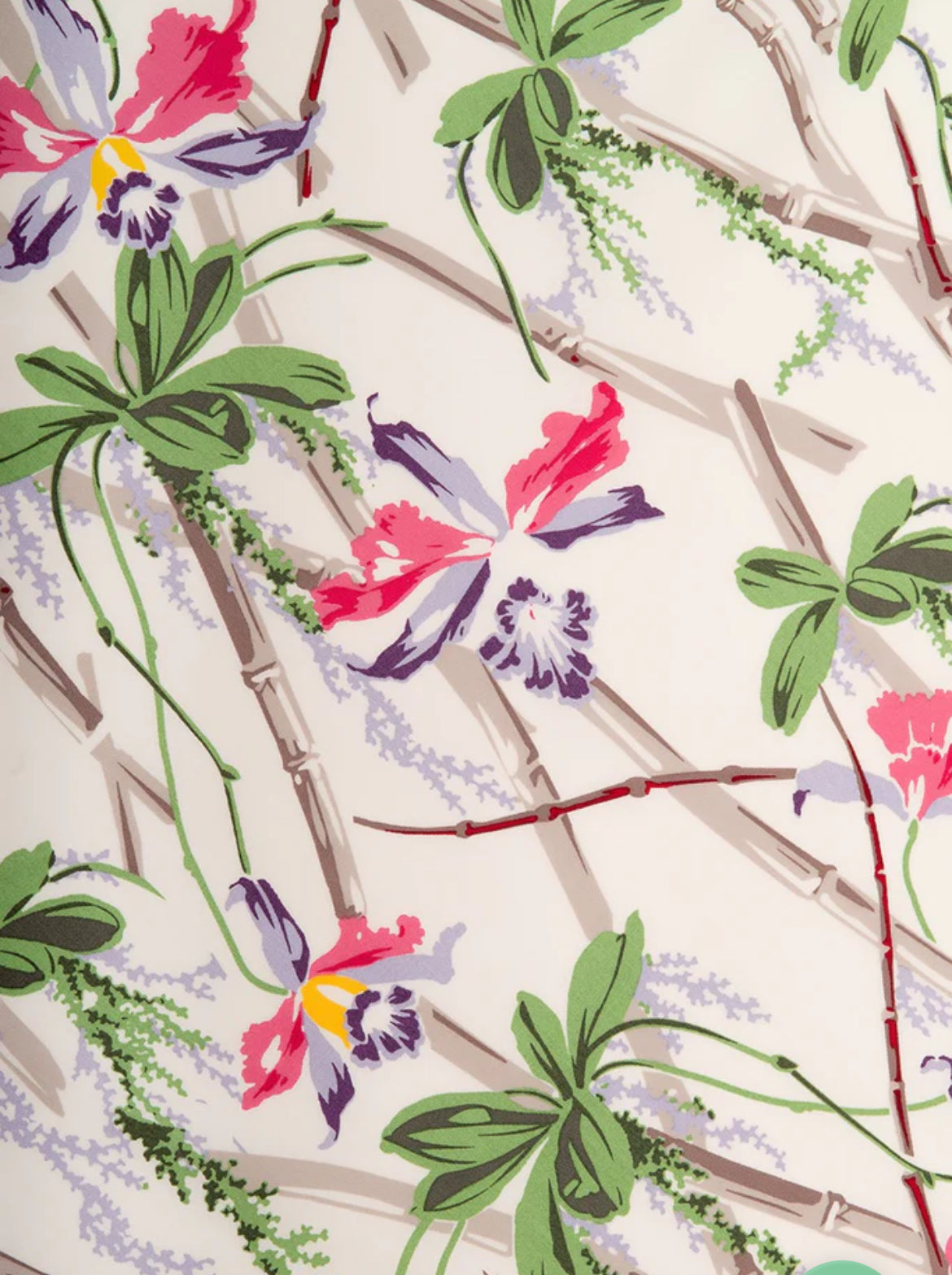 - Print is of bamboo sticks, pink and purple flowers, and green leaves on a cream coloured background.