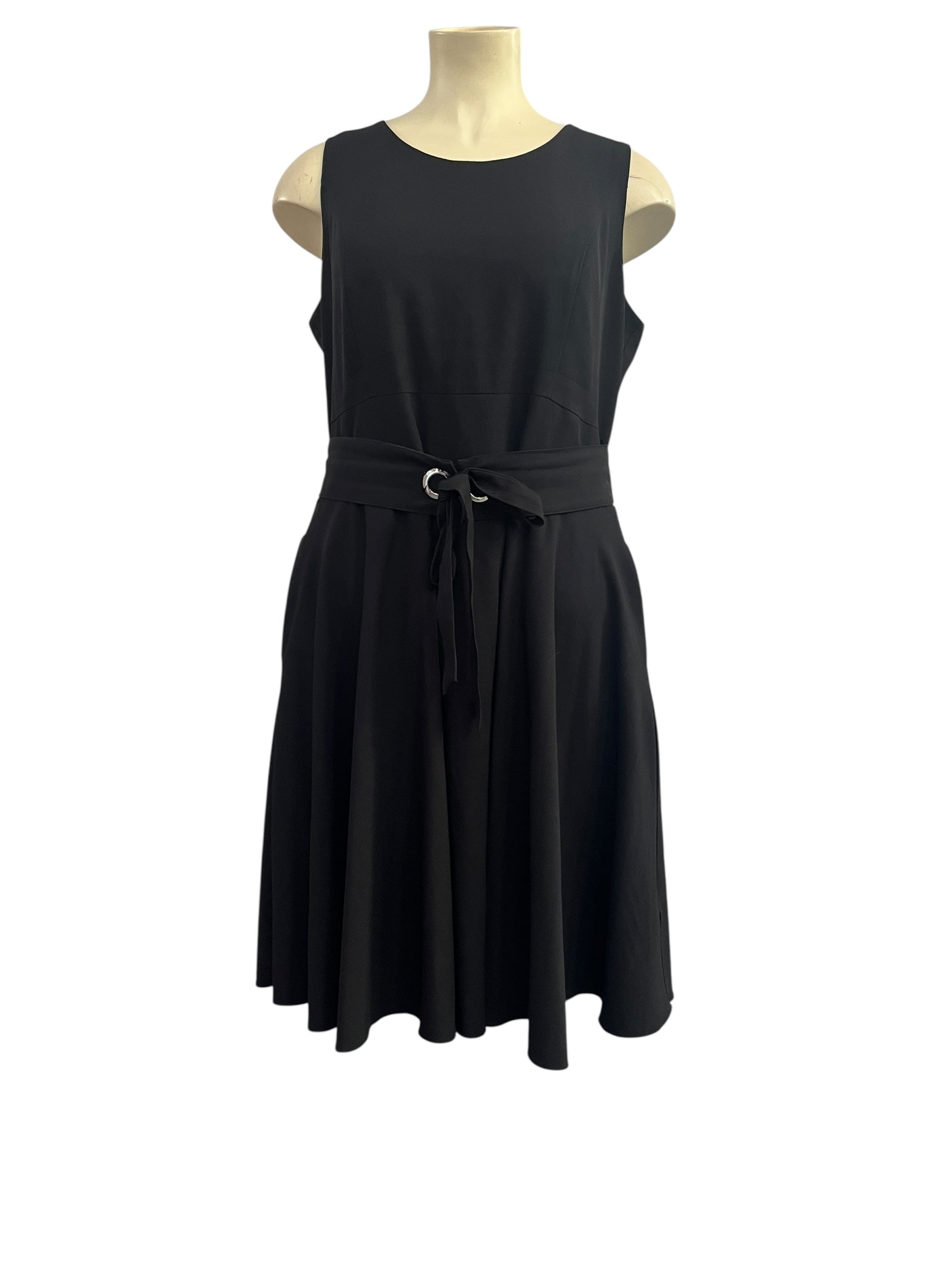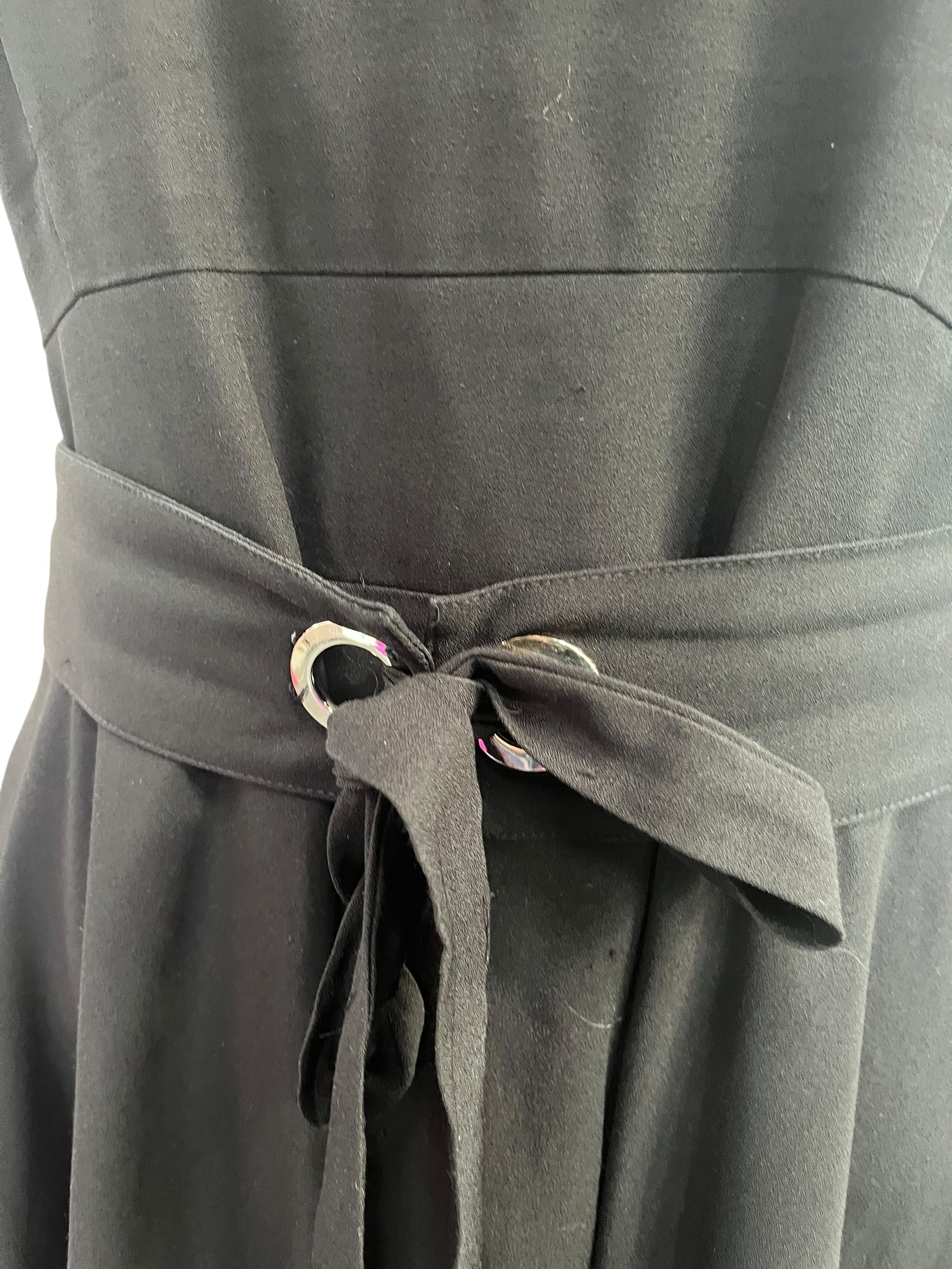 Black lined dress with adjustable gathered waist belt.