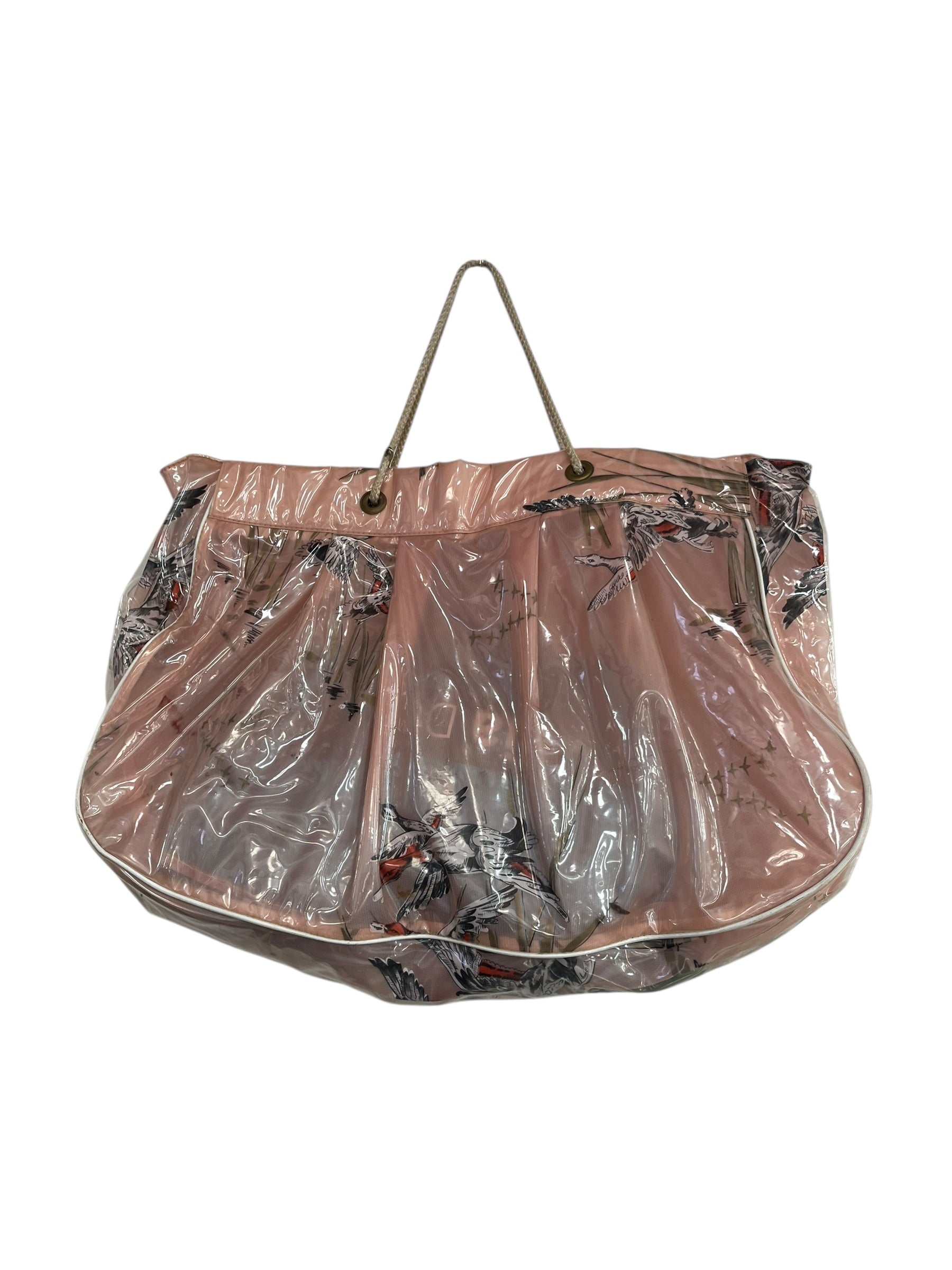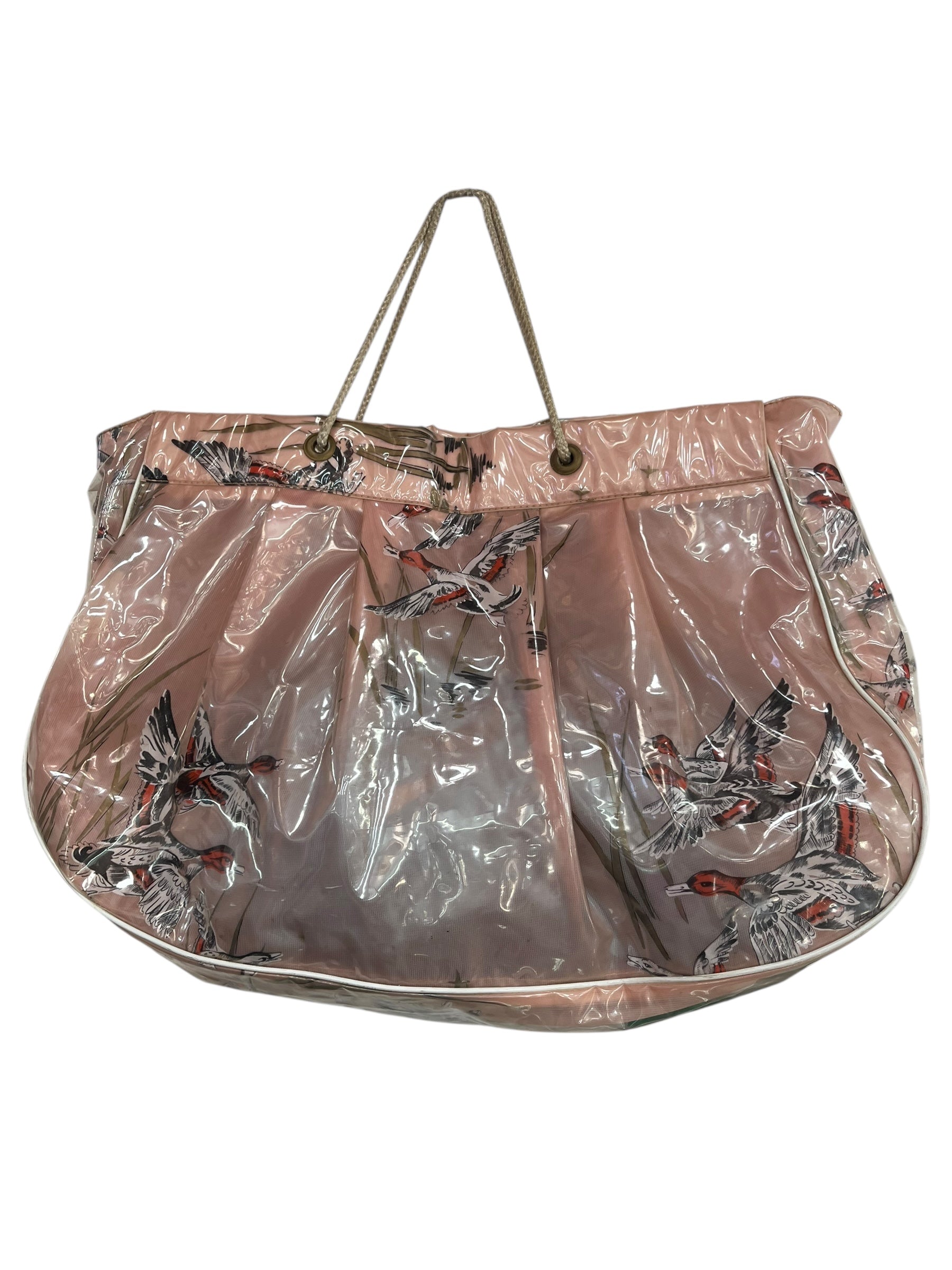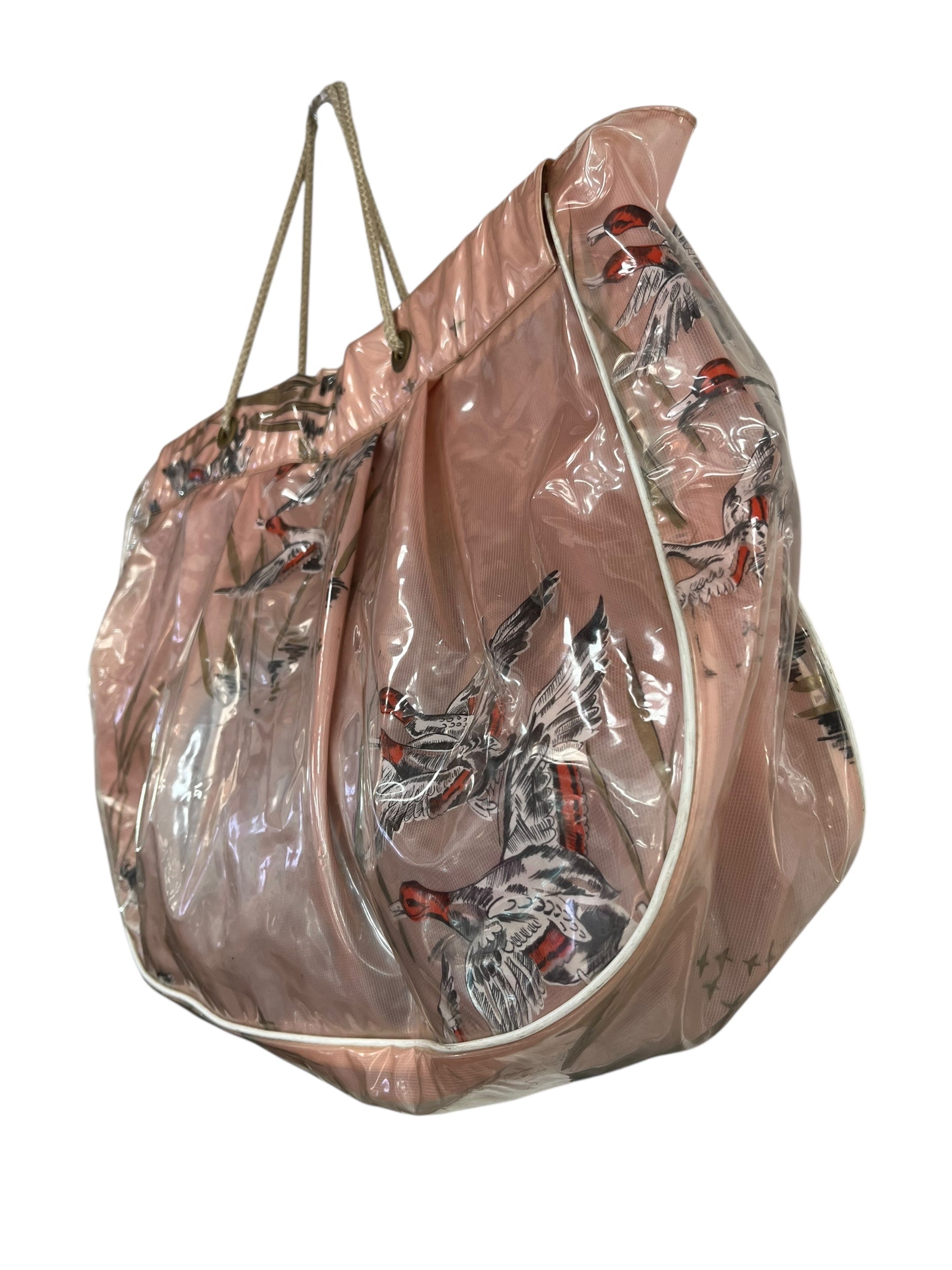 Blush pink swimbag with ducks flying over reeds.