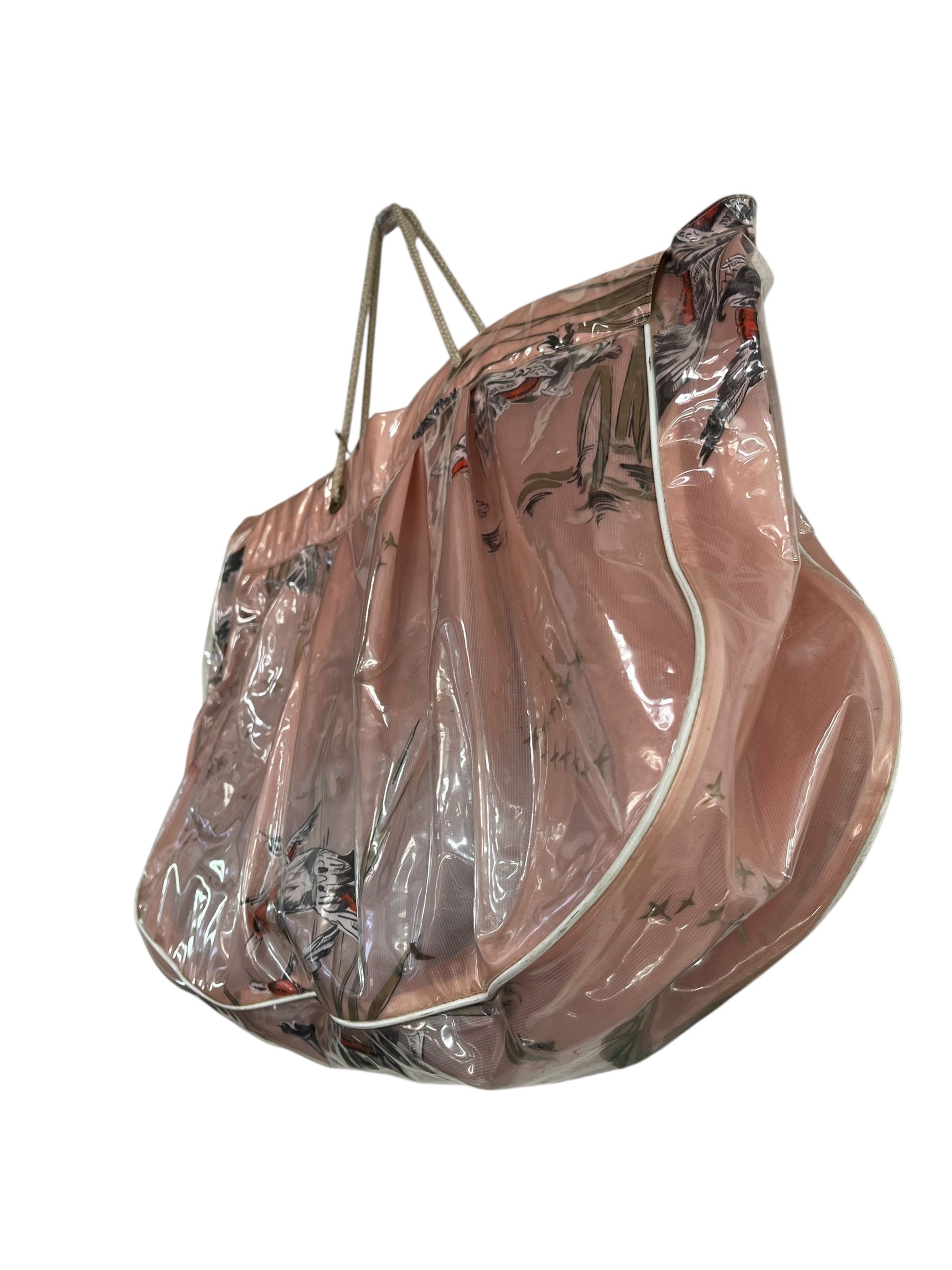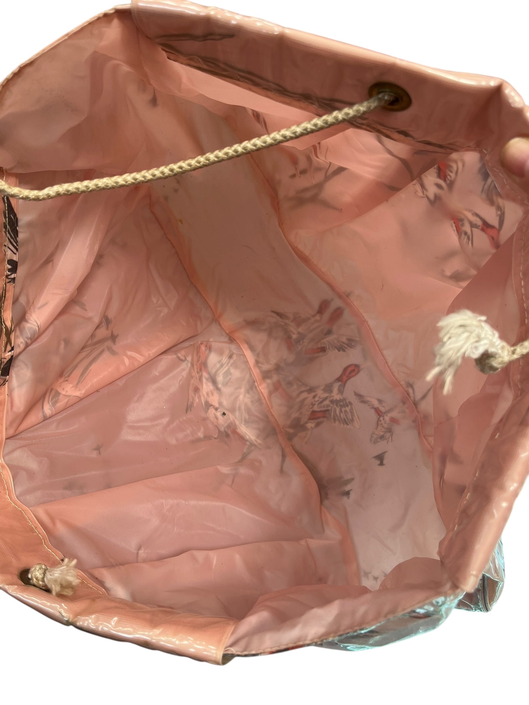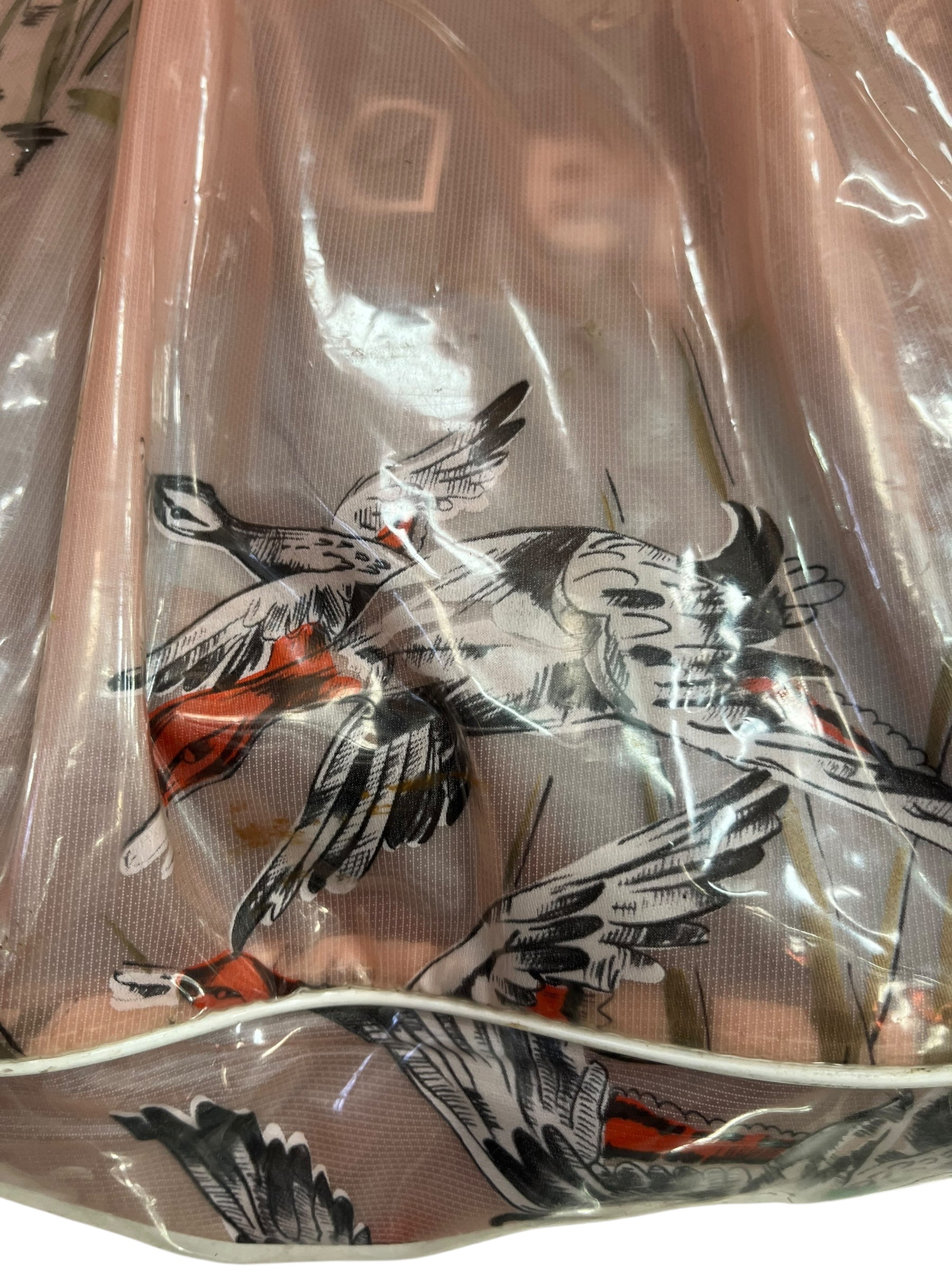 Blush pink swimbag with ducks flying over reeds.
