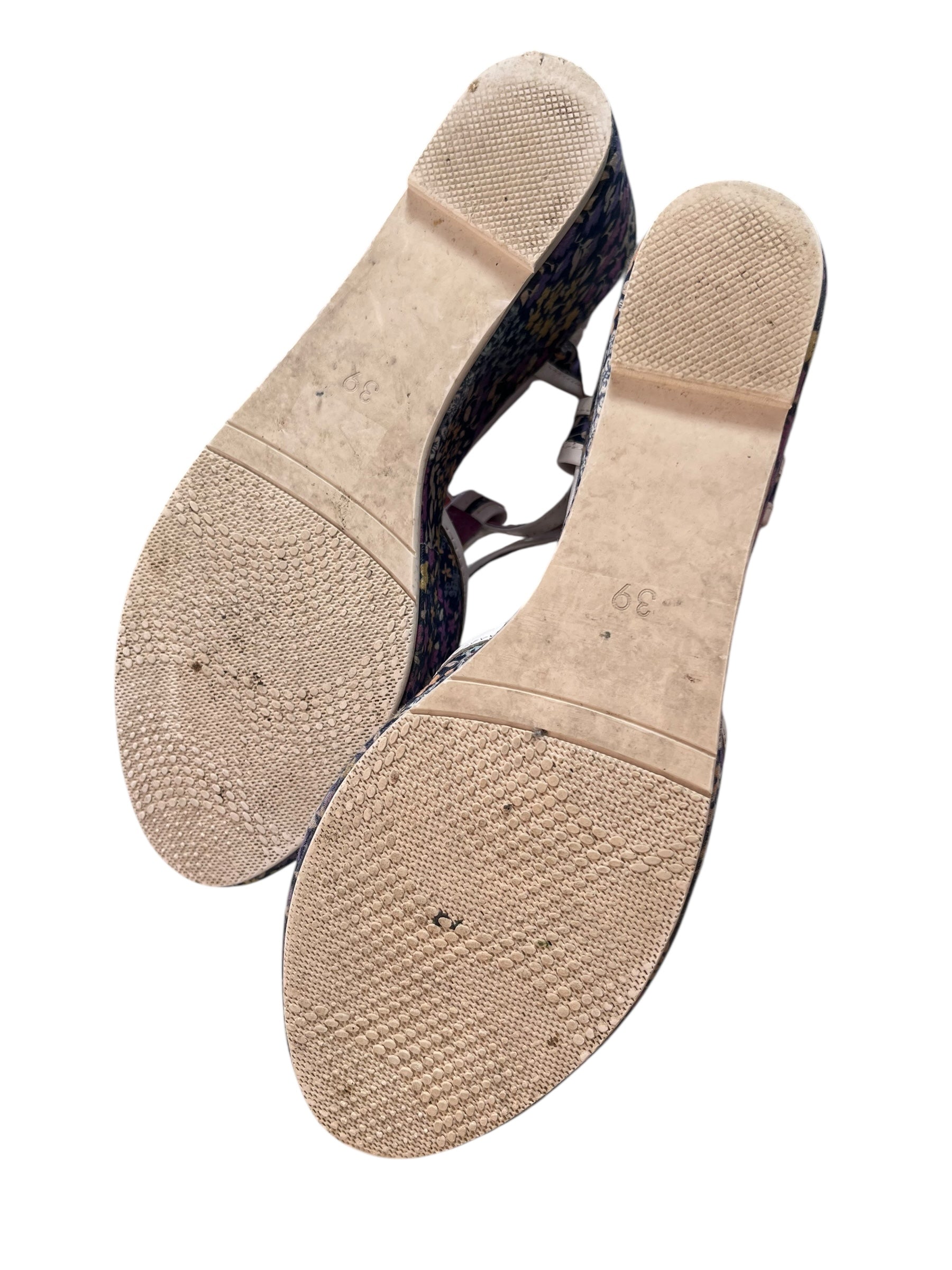 Gorgeous floral wedges. Navy fabric with purple, blue, mustard and white little blooms.