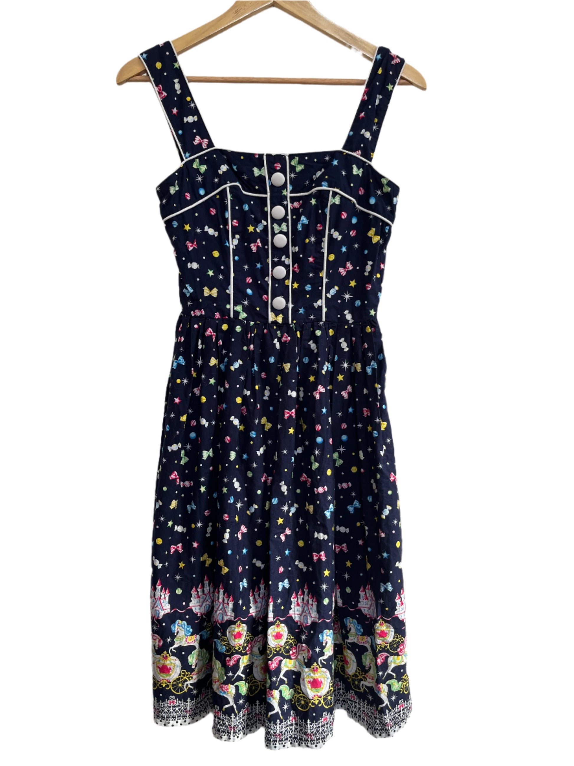 Gorgeous navy dress with Cinderella carriages & castles. Covered in bows and stars.
