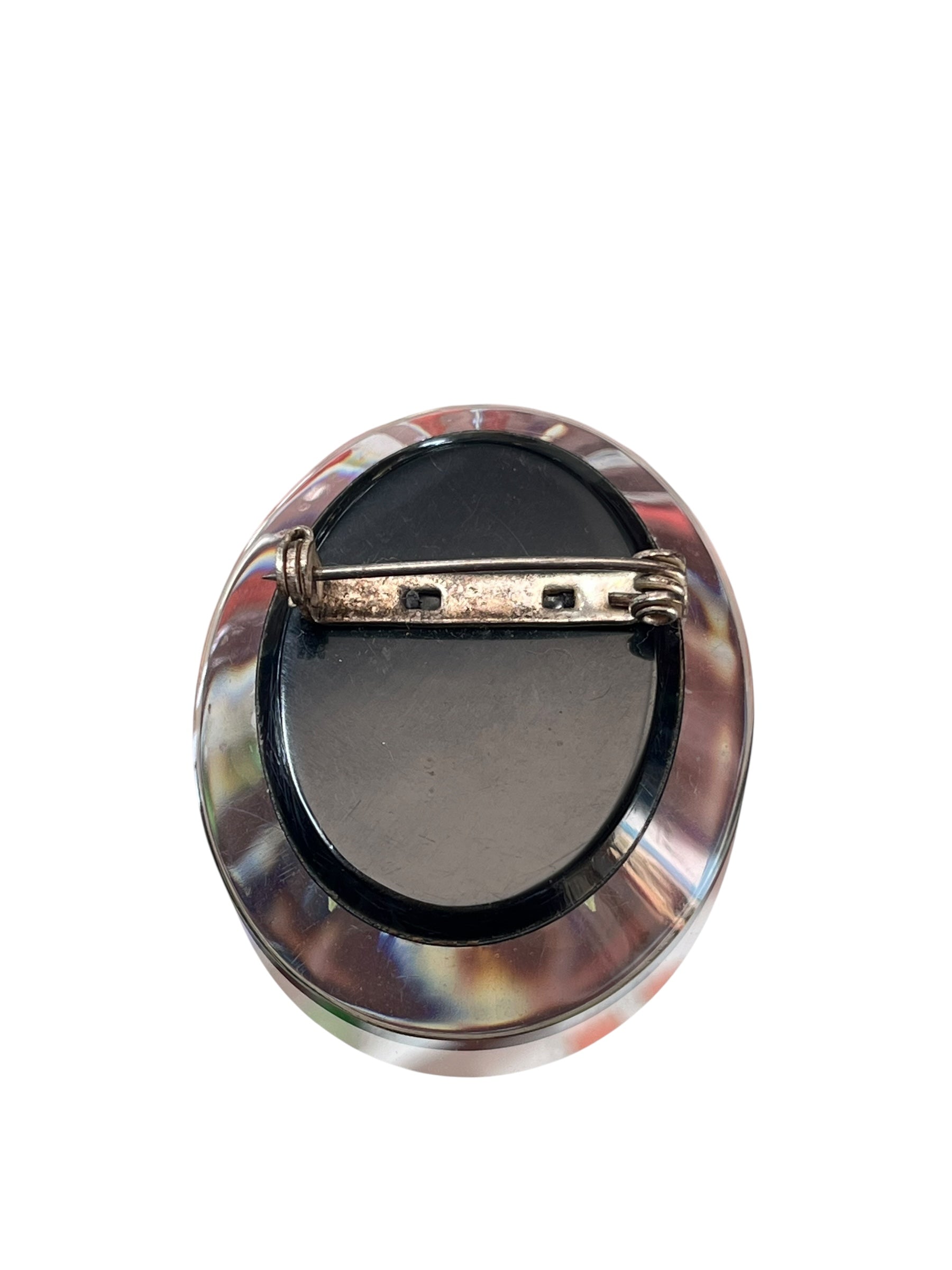 Incredible Lucite brooches first appeared in the 1940s, when wartime restrictions on metals encouraged designers to experiment with new materials. Lucite, a lightweight and durable acrylic plastic, proved perfect for creating bold, colorful, and often whimsical pieces of jewelry. From carved flowers and glitter-filled designs to novelty brooches shaped like animals or household items, Lucite quickly became a fashionable and affordable way for women to add personality to their outfits. Popular through the 1950s and into the early 1960s, these brooches are now highly collectible for their craftsmanship, playful charm, and the way they capture mid-century style.