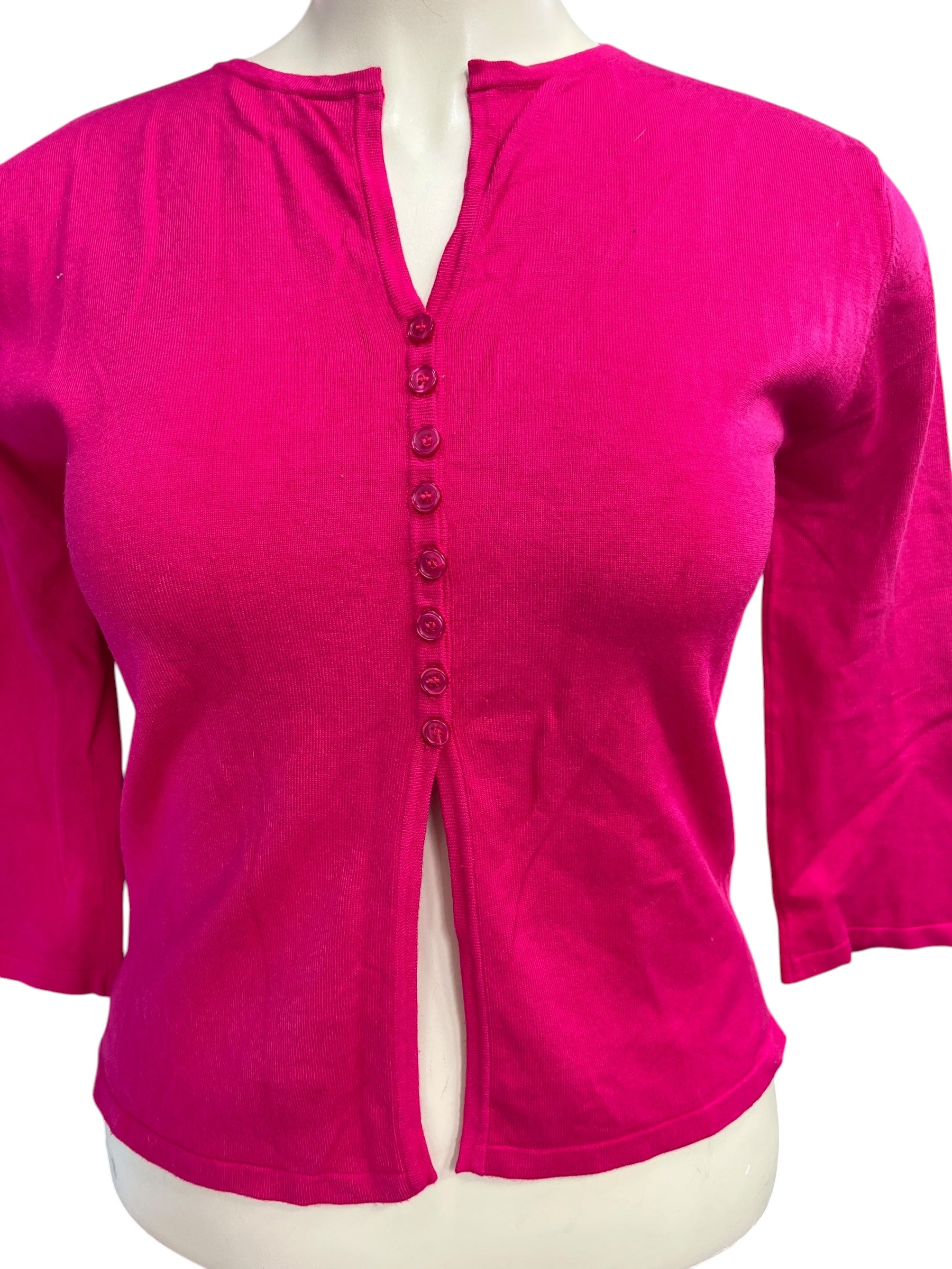 Pink cardigan with buttons in the middle to give a split at top and bottom.