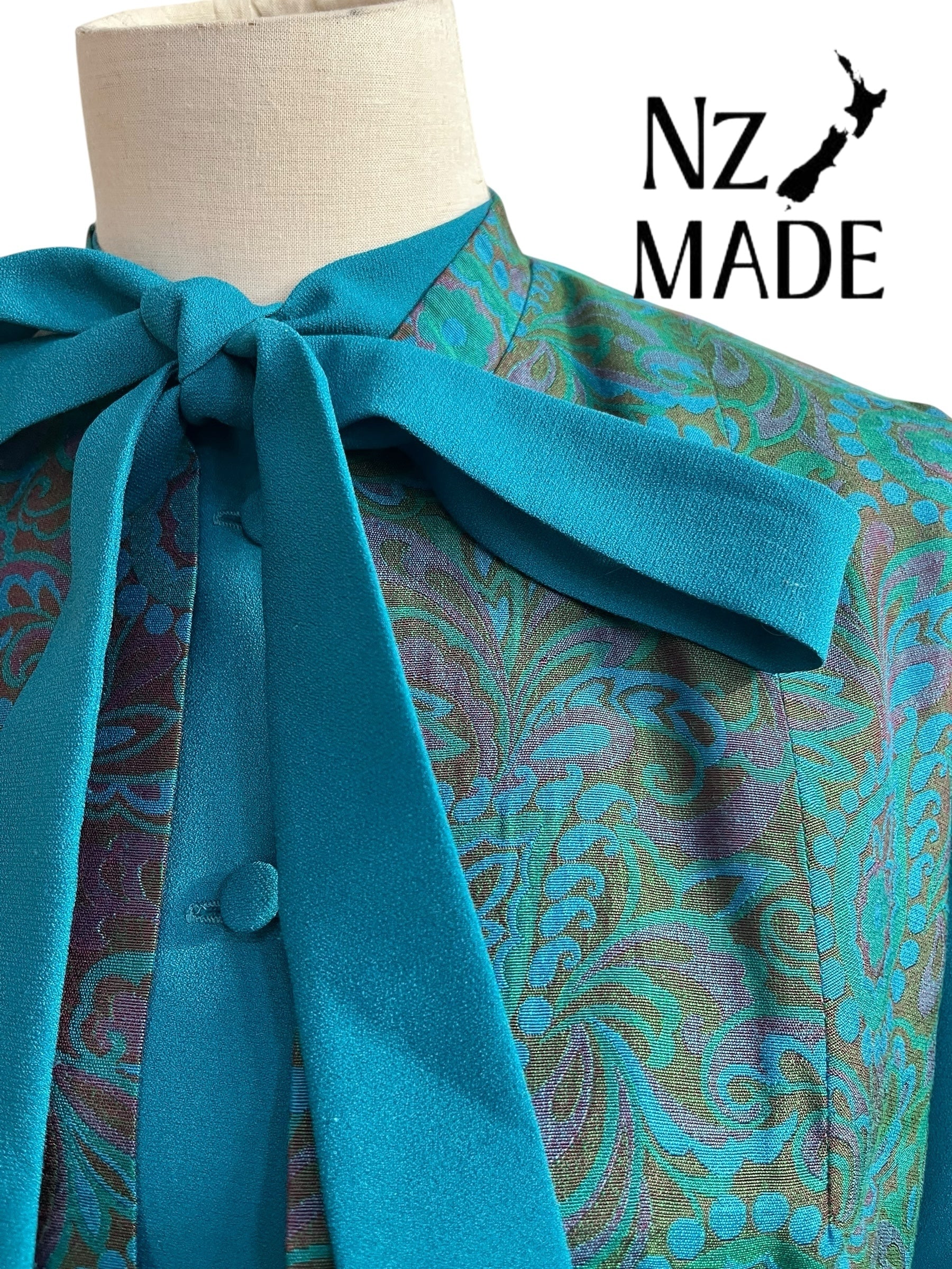 A true statement set from the 1970s, this vintage Soneil ensemble features a fitted pencil skirt, a structured vest with front pockets, and a coordinating button-up blouse with a tie at the neck. The colour palette is a dream—deep, silky tones of peacock green, rich purple, and teal. The skirt is fully lined with a zip and button closure, while the vest sits beautifully layered over the blouse for a polished, put-together look. Labelled a vintage size 16 but best fits a modern NZ 10–12. A rare and elegant find from a lesser-known New Zealand label, perfect for lovers of bold retro style.