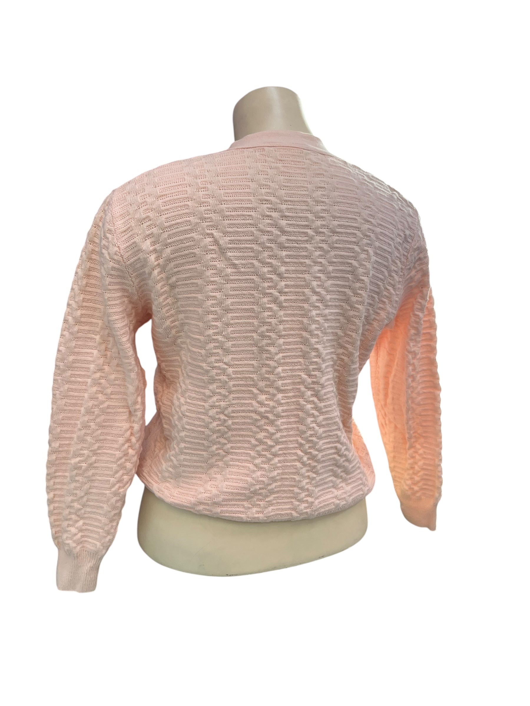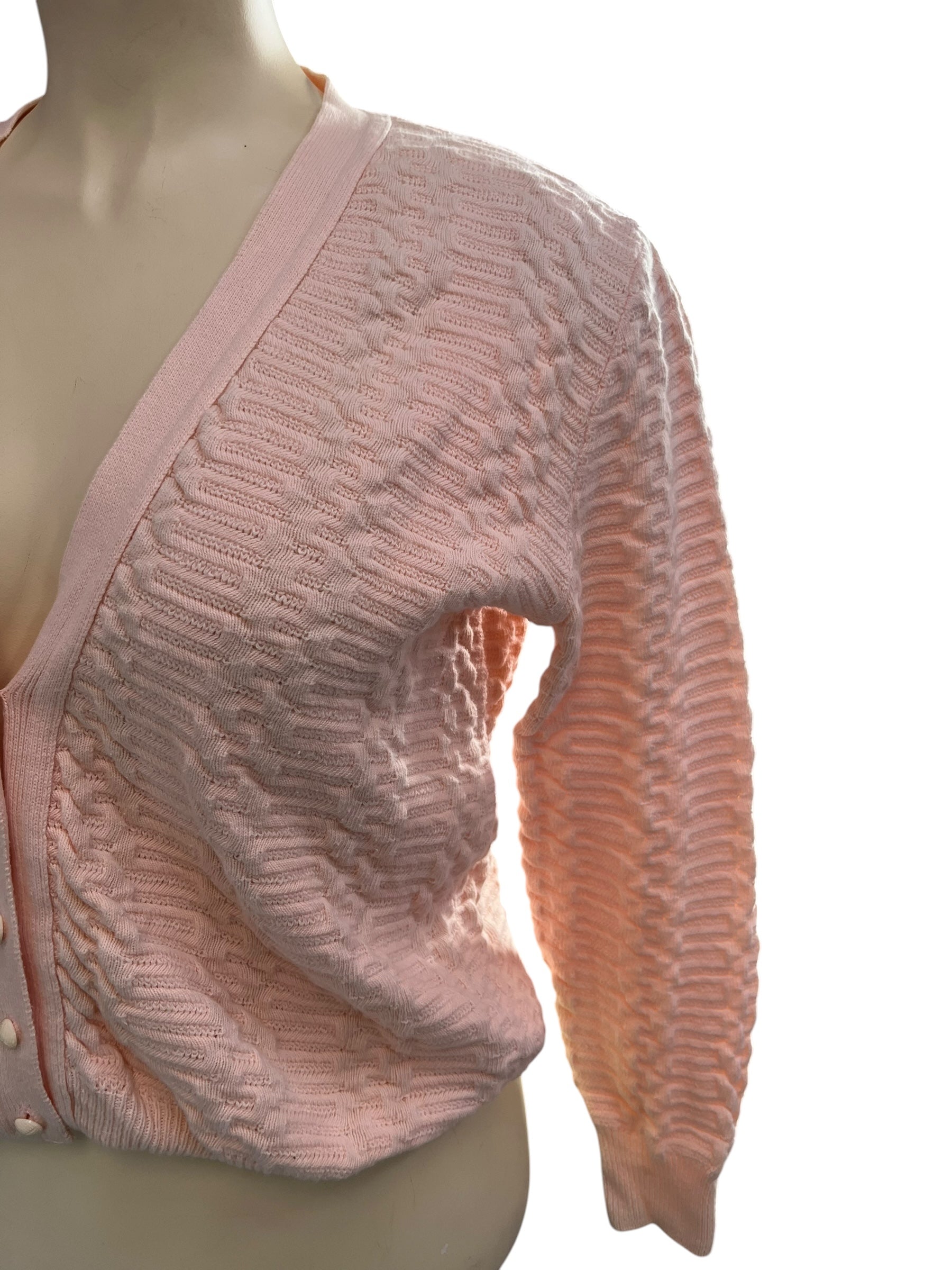 Soft peach cotton cardigan in a textured knit.